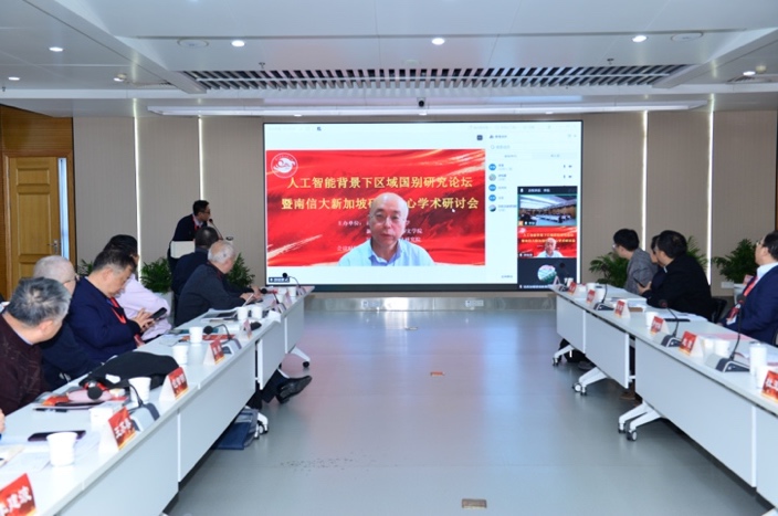 游俊豪教授以《社会经济景观的交叠构成:新加坡与中国关系案例研究》为题,从历史脉络、侨乡网络与国际治理等多维视角探究中新关系的互动交融,解析了中新两国族群、科技、金融、媒体等景观的交叠构成。罗林教授发表题为《AI赋能区域国别研究的现状与展望》的主旨报告,系统阐述了大数据对时代发展的影响,区域国别学的学科使命和大数据发展下的第四次范式革命、人工智能与大数据对效度分析的赋能、AI赋能下的动态分析、专题分析、趋势分析具体应用。杜玉生教授在总结中强调,区域国别学研究须紧扣国家战略、教育部学科建设要求并重视技术赋能。